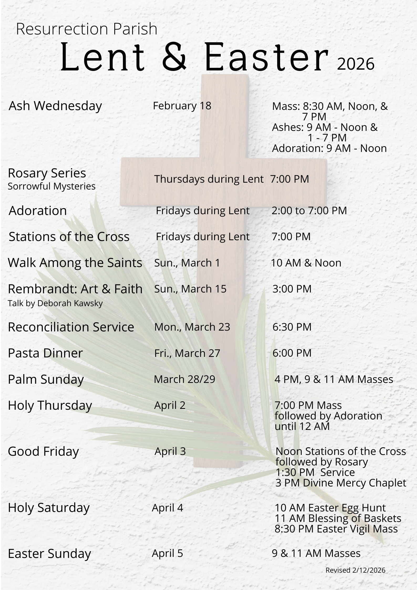 Resurrection Parish was founded in 1990 when a small group of pioneering families was invited to start a new parish under the leadership of Father Dick Perfetto. In the early years, parishioners gathered and worshiped at temporary locations until construction of the church building was completed. Through their shared sacrifice and pioneering spirit, the members of Resurrection Parish built a welcoming community of families that was committed to serving others in the name of Jesus Christ. More than 30 years later, our Resurrection Parish family remains strong and dedicated to living out the Gospel.