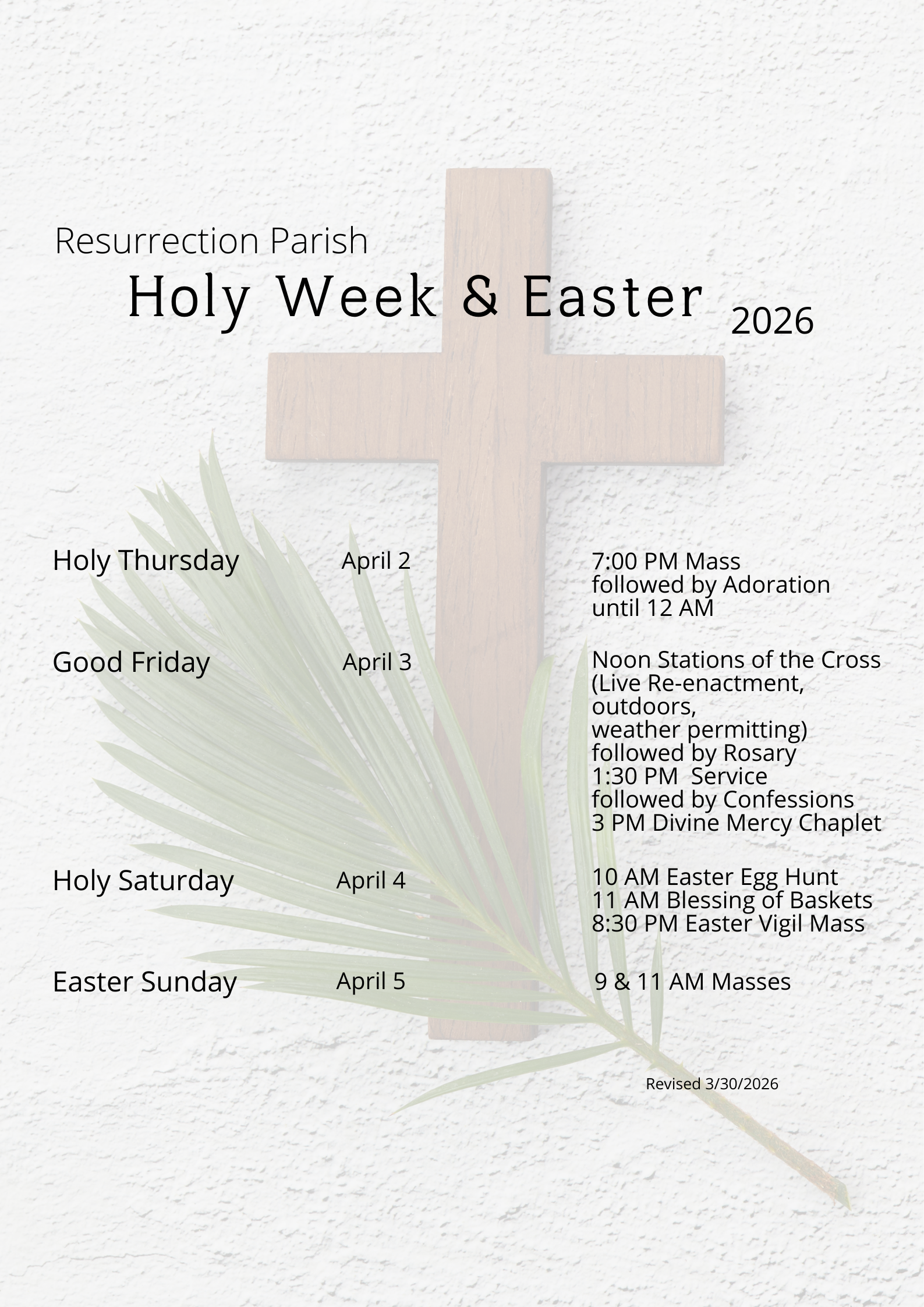 Stations of the Cross at 12 Noon (outdoor re-enactment, weather permitting) followed by Rosary